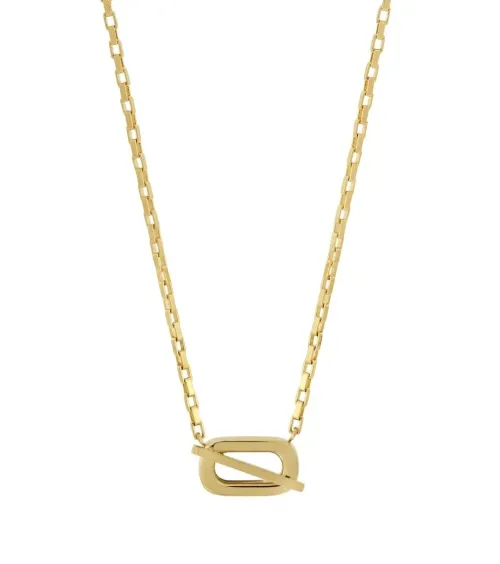 Evangeli är en elegant klassisk serie där formerna spelar rollen. Den mjuka rundade dekorationen möter en skarpare kedja med fyrkantslänkar. Klassiska former som blir coola ihop, en serie du bär både till vardags och fest. Dekorationen är inspirerad av ett t-lås och ses här i blank 14K guldplätering.
