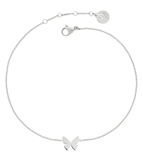 Papillon fotlänk har den lilla fjärilen fäst på en ankarkedja, här i blankt rostfritt stål. Fjärilen symboliserar olika saker i olika kulturer, en universell symbol som fascinerar människor runt om i världen.