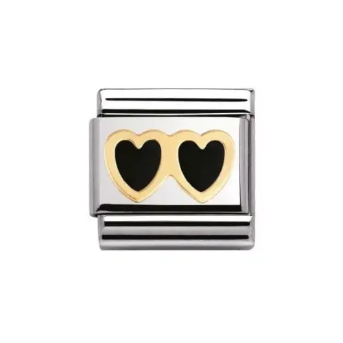 Nomination Classic. Dubbla hjärtan i svart emalj, 18k guld och stål 10X8mm.Kombinera ditt eget armband.