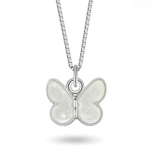 ”Se! En blomma med vingar!” Den här klassiska fjärilsmycket känner många människor igen från sin egen barndom. Fjärilarna finns i flera färger, precis som äkta fjärilar. Smyckena är i silver 925 och belagda med vit emalj.