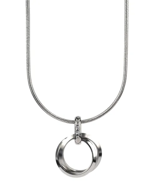 Kort halsband med hänge av 2 sammanlänkade ringar med små stenar.