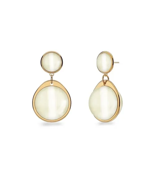 Summit är vårens sköna statementsmycken i färgat glas med tiger eye-effekt. Snygga Summit örhängen blir en favorit både till vardag och fest med sina rosa stenar som tar för sig. De mindre örhängena har både en rund och en mer droppformad form och ses här med vitt glas och blank 14K guldplätering.
