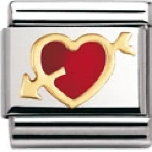 Nomination Classic. Hjärta i röd emalj med pil i 18k guld och stål 10 x 8mm.Kombinera ditt eget armband.